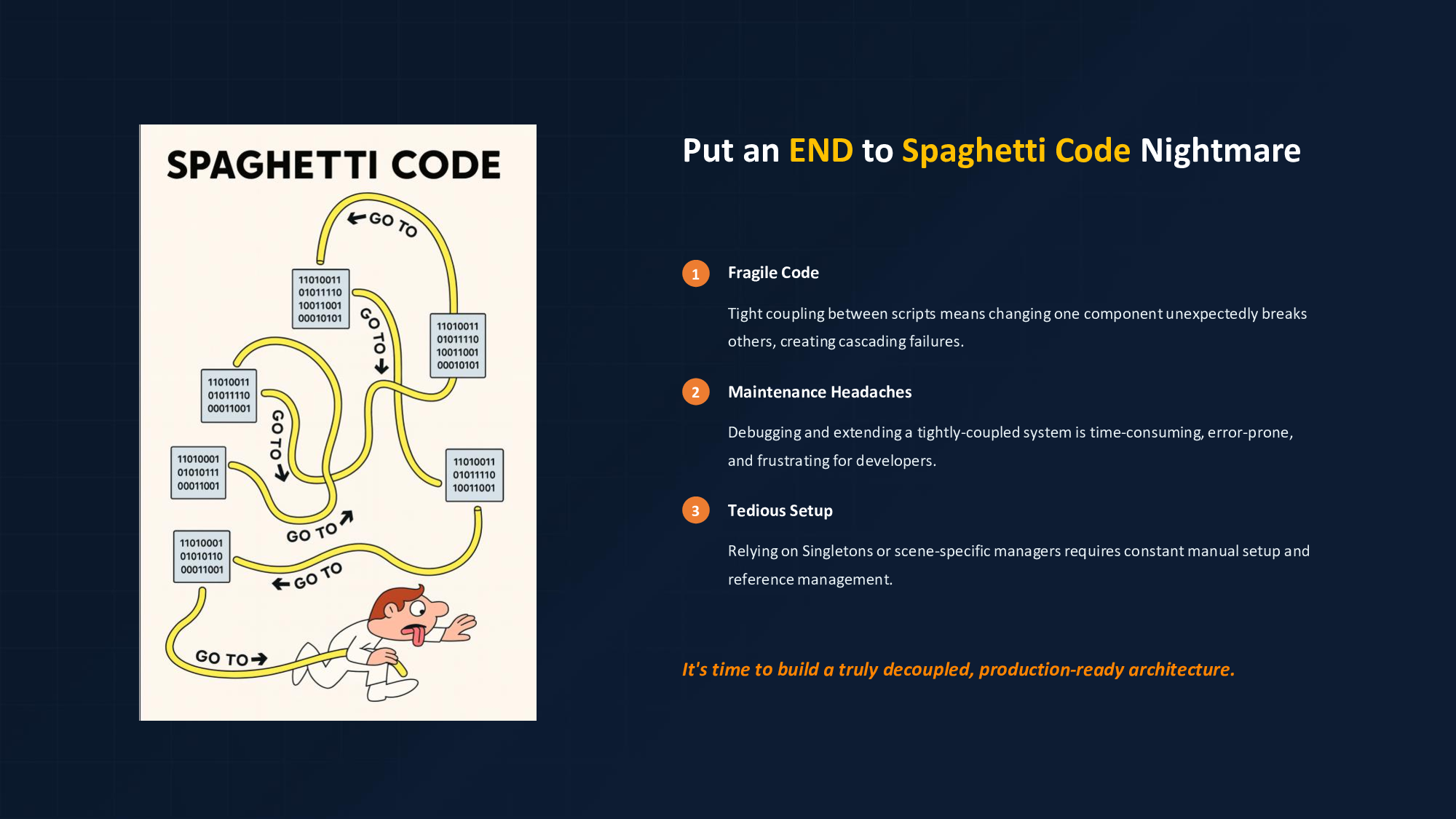 Spaghetti code and complicated script inter-dependency affect most apps and games in the market right now. You can solve it once and for all, easily, with minimal setup and maximum support, in less than an hour.