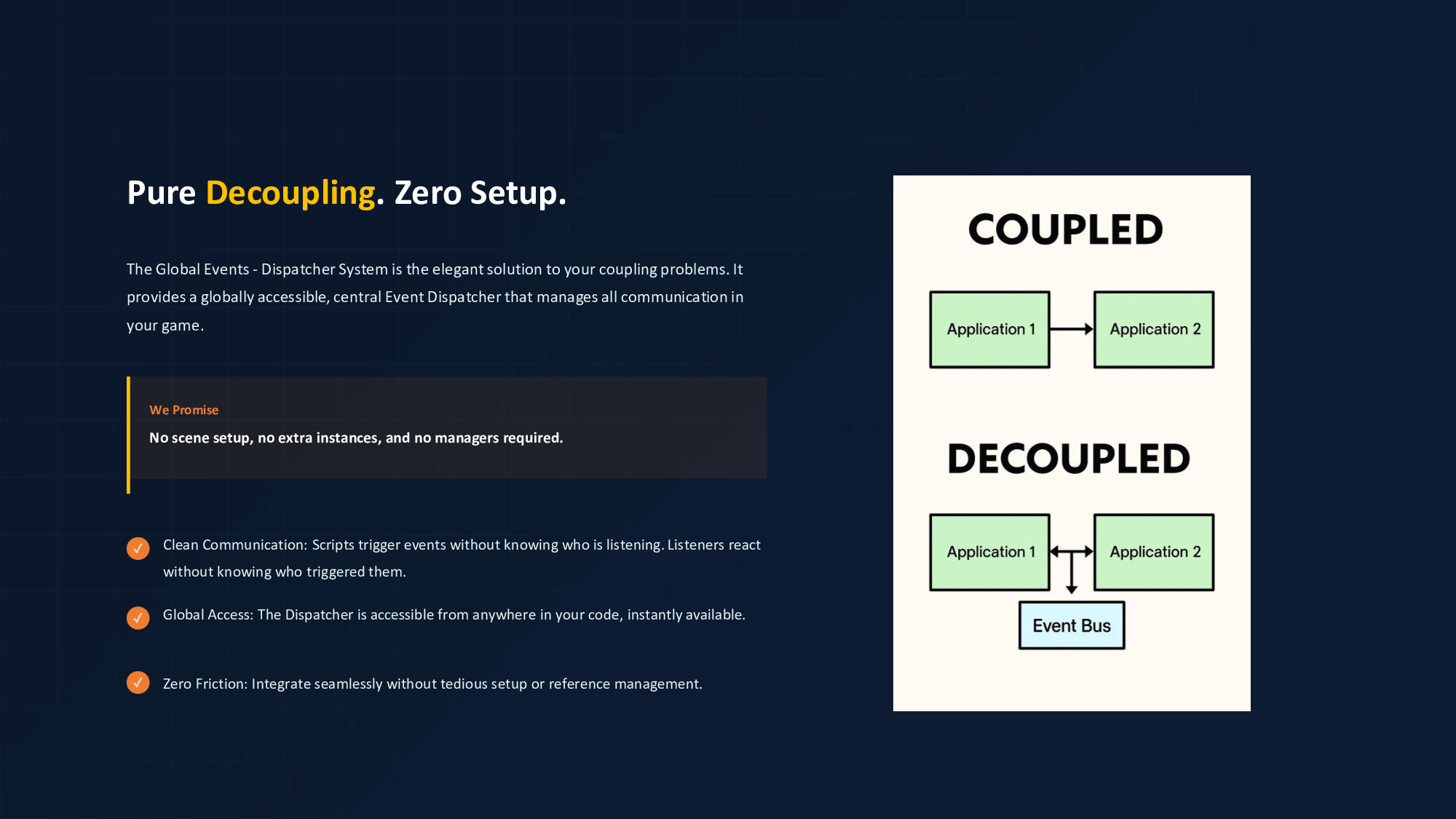 | Tags | architecture, event-bus, event-dispatcher, global-events, production-ready, Unity, unity-events, unity-tools |