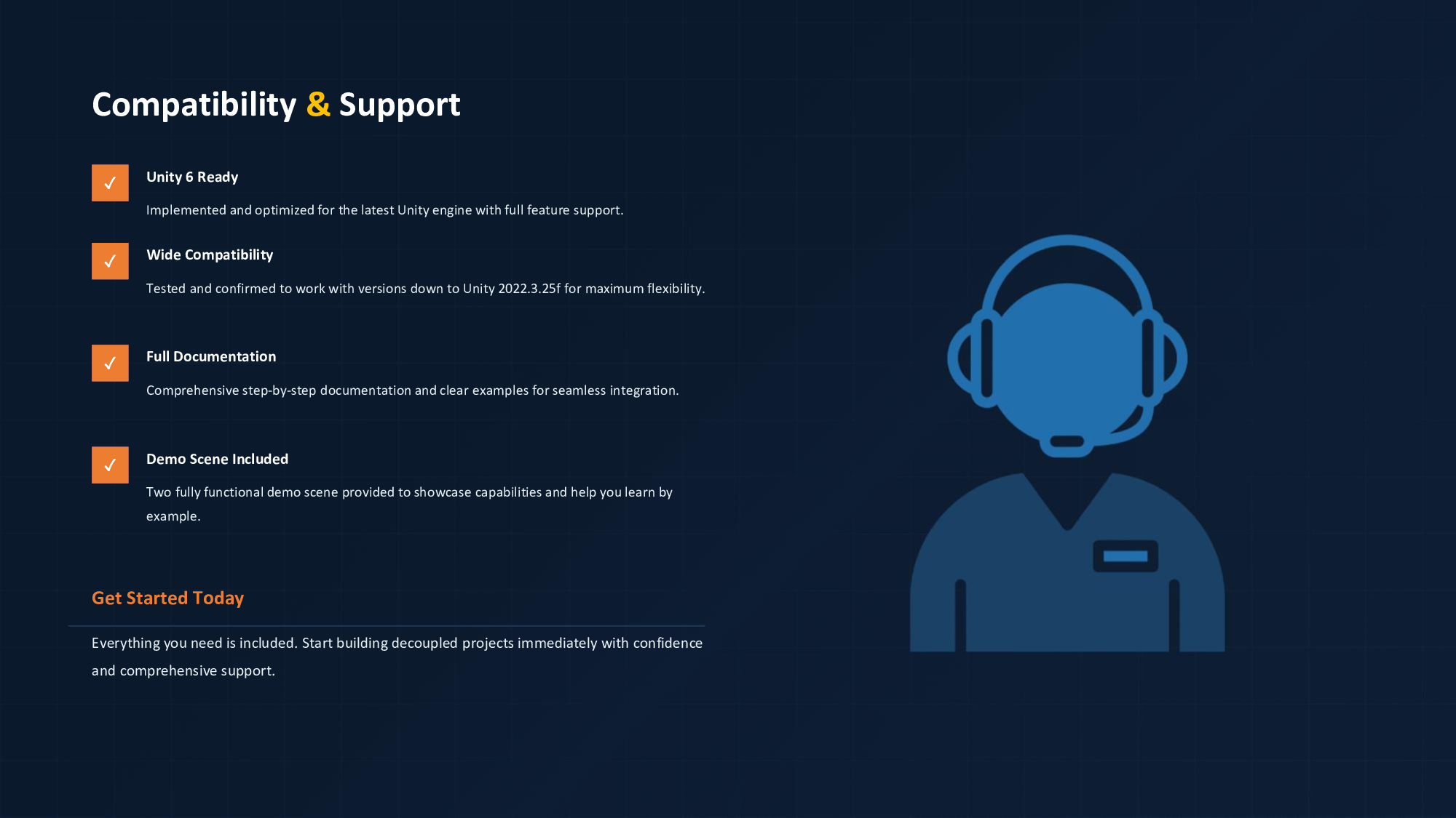 All of our packages are written by experienced industry professionals and tested in real, commercial projects. We include descriptive documentation, example scenes and step-by-step instructions so even unseasoned application developers can use our tools.